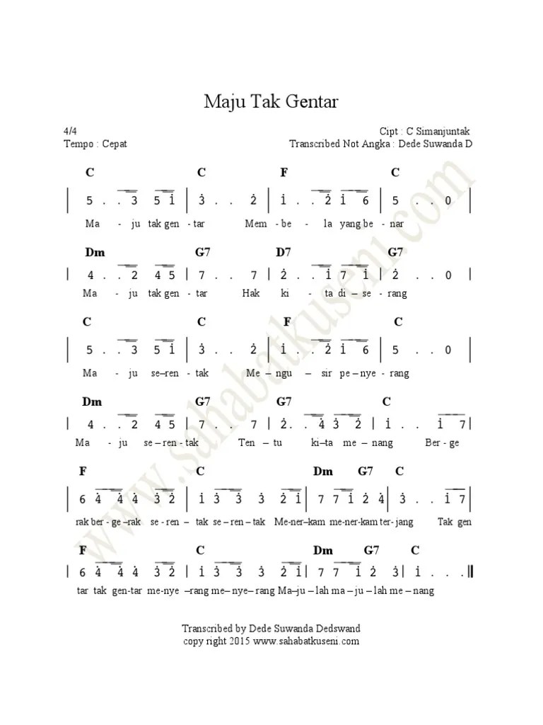 Not angka lagu maju tak gentar . Detikers hafal lirik lagu maju tak gentar? Lagu ini diciptakan oleh cornel simanjuntak. Maju tak gentar, membela yang benar Lagu ini juga menggambarkan keberanian rakyat indonesia, yang kala itu dilengkapi perlengkapan seadanya, tetapi berani melawan belanda.